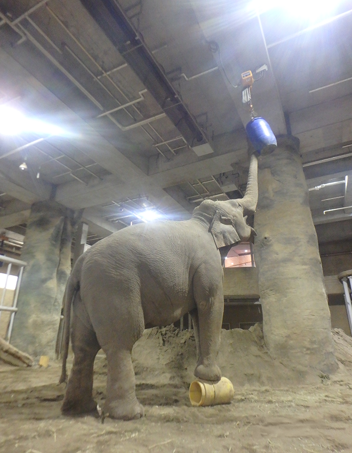 多摩動物公園のアジアゾウ舎は、高所にえさを入れたフィーダー(給餌装置)を吊るすことができるようになっています。これにより、鼻を上げて食べ物を取るというゾウ本来の動きが引き出され、首や肩の筋肉が鍛えられることで適切な体型を維持することが可能となります。少し高めにフィーダーを吊るすと、簡単には鼻が届かないため、ゾウは近くにある丸太やガス管を踏み台にしてえさを取ります。