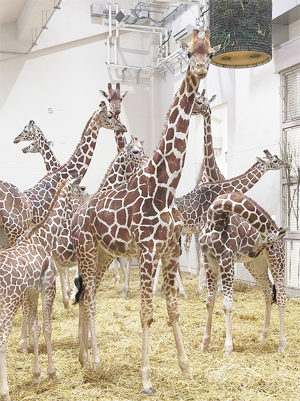 識別の仕方には私の主観も入っていますので、この情報や写真をもとにして網目模様のおもしろいかたちなどを見つけてそれを目印にするのも一つの方法です。これで前回紹介した個体と合わせると10個体を識別できることになります。室内展示スペースも開放になったので、雨で外へ出せない日や収容後もキリンを観察可能になりました。まだ寒い日が続きますが、迫力あるキリンたちの群れを観察しに足をお運びください。