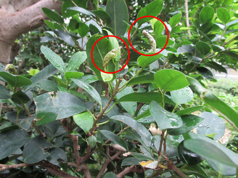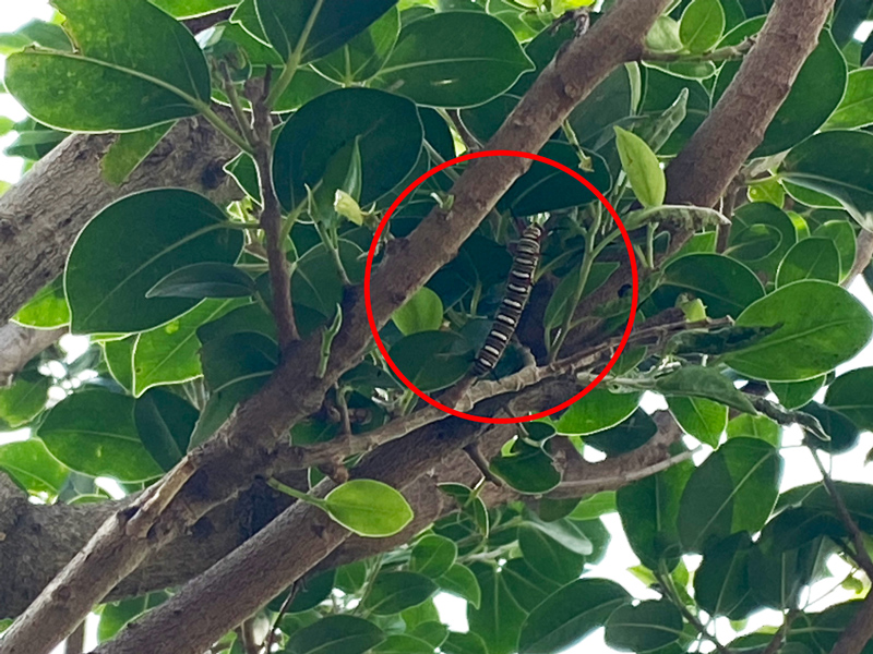 その後も定期的にアザミウマを駆除して、以前に比べると葉の状態はだいぶよくなっています。しかしつい最近も、ふと見上げるとガジュマルの枝に大きく育った幼虫が……