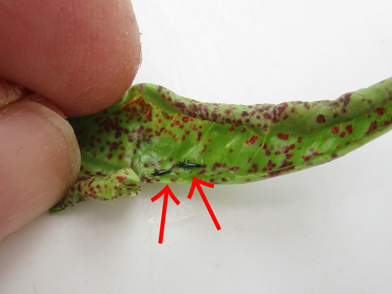 | アザミウマにやられたガジュマルの葉 | (葉を広げて中からでできた)アザミウマ |