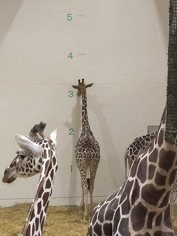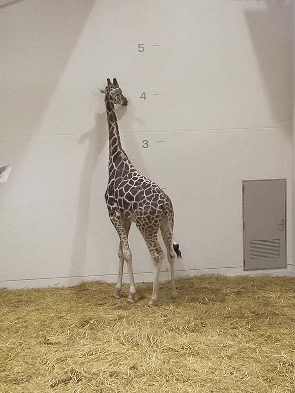 いずれ公開される室内展示に向けて、担当者の発案で寝室の壁にキリンの大きさがわかる5mまでの表示を付けました。キリンが運動場に出ているあいだに、担当者4人で協力して壁にペイントしました。夕方、寝室に戻ってきたときはまだ塗料のにおいが残っていたようで、数頭のキリンが気にして確かめていました。そのときの写真が、まるで身体測定をしているようでしたのでご覧ください。