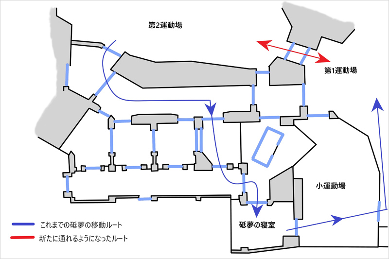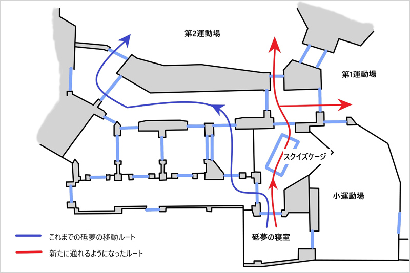 寝室から第2運動場に出るルート。 スクイズゲージを通過して第1運動場にも出られる | 運動場から部屋に戻る逆バージョンに挑戦。 中のようすを確認中…… |
