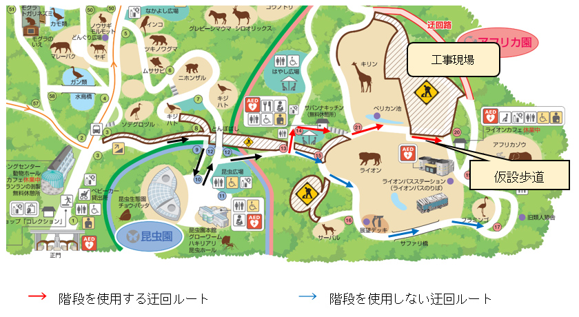 →ルート)。このため、車椅子、ベビーカーなどご利用の方は、パーゴラ(東屋)前からサファリ橋の方に迂回することになります。(
