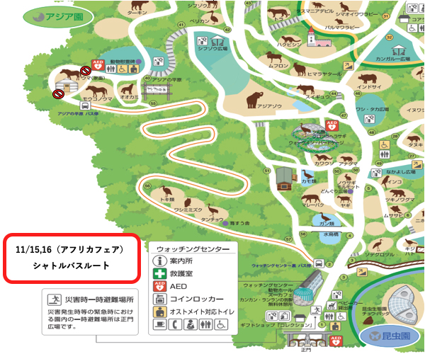両日とも園内混雑が予想されるため、園内を巡回するシャトルバスの運行区間を変更します。また、バス転回時における安全確保のため、ウマ(家畜)放飼場横の園路を通行止めにします。