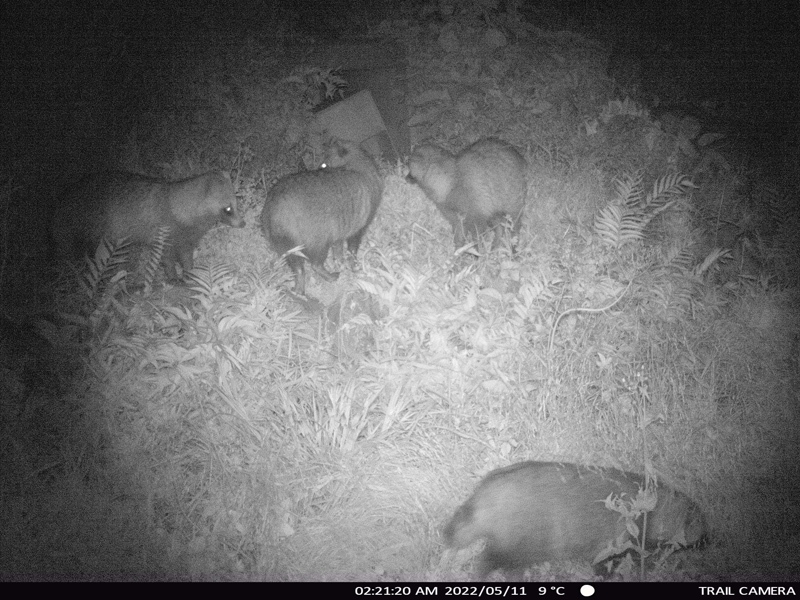下の写真はえさを求めて動き出すタヌキたち。草むらをかき分けてえさを探しています。