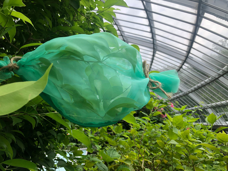 そこでいろいろな可能性を考慮して、キョウチクトウだけでなく食樹のガジュマルとベンジャミンも使い、袋掛けという方法で飼育を試みることにしました。袋掛けとは、地植えや鉢植えの木の枝に幼虫をつけ、それを網袋で覆う飼育方法で、ビン挿しよりもえさの植物がしおれずに長持ちします。また、網袋でしっかり覆えていれば、野外でもアリやハチなどの天敵に食べられることはないはずです。