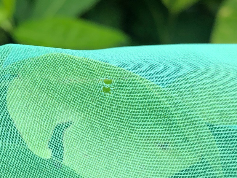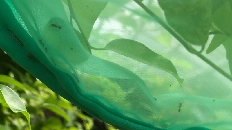 さて、実際に8月上旬に生態園内の上記3種類の食樹に幼虫をつけ、袋掛けをおこないました。数日後、ある程度育っていることを期待して袋を開けてみたところ、なんと、すべての袋で幼虫が1匹もいなくなっていたのです。かわりに、天敵のアリが入っていました。袋の口はしっかり閉めたにもかかわらずどこから入ったのだろう?とよく観察してみると、袋に小さな穴が開けられていました。どうやらアリが大あごで穴を開けて中に入り込み、幼虫を食べてしまったようです。袋の中の幼虫をめざして穴を開けたのか、それとも別の理由があったのかはわかりませんが、まさかこの短期間で全滅とは……。思ってもいない展開に肩を落としてしまいました。