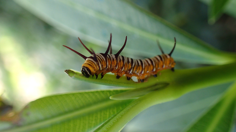 幼虫はチョウ飼育室で飼育し、えさとしてキョウチクトウの枝葉をビンに挿すビン挿しという方法で与えていましたが、7月下旬ごろからうまく育たない個体が目立つようになってしまいました。キョウチクトウはこの時期はえさとして不適なのだろうか? ビン挿しでは葉がしおれてえさの質が悪くなってしまうのだろうか? うまくいかない理由を考えましたがはっきりしません。