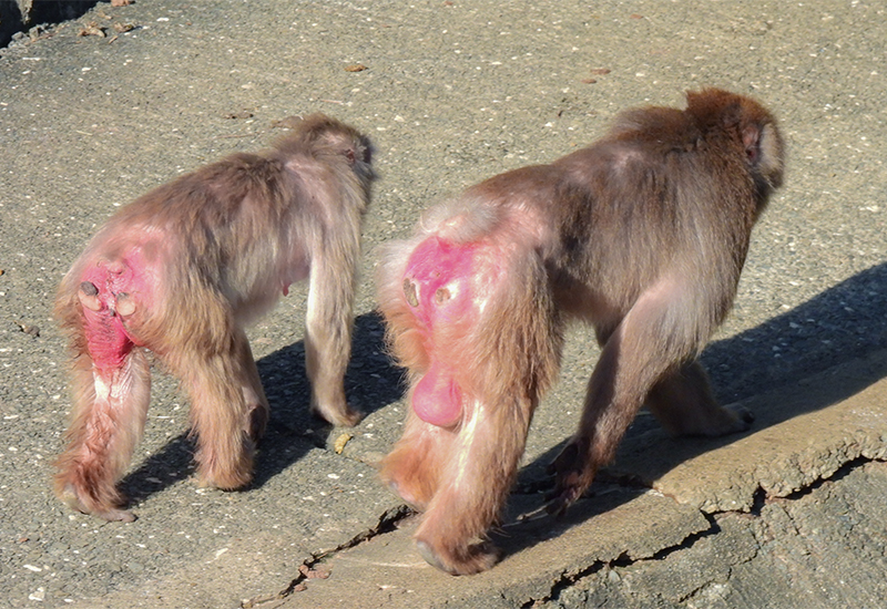 ニホンザルはその生理・生態的特徴として、おおよそ9月〜12月にかけて交尾・妊娠が可能になります。9月になると少しずつサルの体や行動が変化してきます。オスは肩を怒らせ尾を挙げ、顔とお尻が赤みがかり、精嚢には睾丸が落ちて鶏卵大にふくらみます。