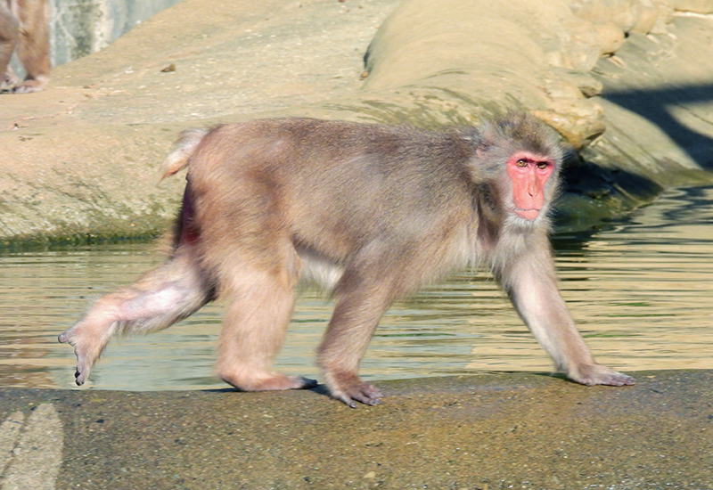 メスもオス同様に顔とお尻が赤みがかり、さらにはホルモン動態の影響により断続的に繁殖期特有の鳴き声を発します。野生のモンキーウォッチングにおいても秋の繁殖期には騒がしい鳴き声やオスによる木ゆすり、メスがオスの注意をひきつけてオスがメスを追いかける行動などによって群れの存在が確認しやすく、観察に適した季節になります。