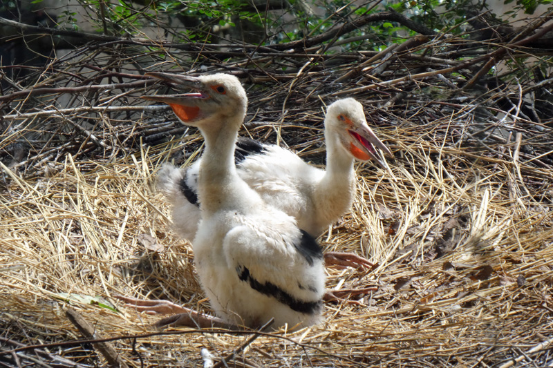 国内の繁殖計画に基づき、今年は子育てエリアのペアにほかの飼育施設のペアが産んだ卵を抱かせて、ひなを育ててもらうことになりました。このペアは、これまでにひなを育てた経験のある子育て上手なペアです。5月22日と23日に、卵からひながかえりました。ひなは約70日間巣にとどまり、親が吐き出したえさを食べて育ちます。コウノトリの子育てはオスとメスが共同でおこないます。ひながもっとも食欲旺盛であったときのアジ、ワカサギ、ドジョウの合計給餌量は3kgを超えました。この2羽のひなは、8月8日に無事巣立ちを迎えることができました。