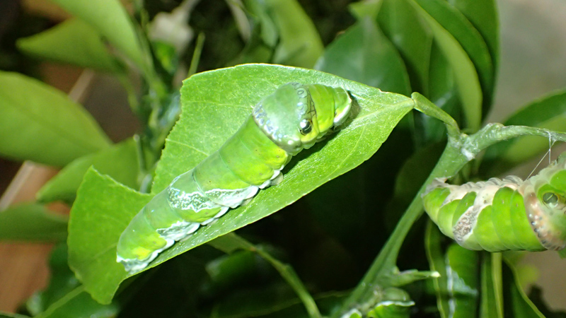 ナガサキアゲハの幼虫には、ナツミカンなどの栽培ミカン類を与えて育てます。クロアゲハなどのほかのアゲハチョウの幼虫と比べると白っぽい体色をしているのが特徴です。成虫が大きいため、幼虫もとても大きく育ちます。そのため、終齢幼虫になると毎日大量のミカンの葉を必要とします。ナガサキアゲハを育てるときにもっとも苦労するのは、この時期に良質で大量のえさを用意することです。