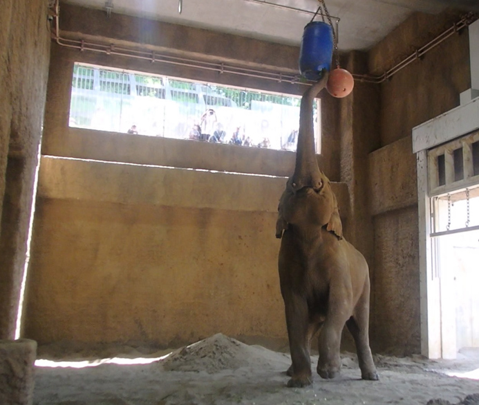 「アジアゾウのすむ谷」では高いところにえさを吊るすことができるようになっており、鼻を上げて食べ物を取るゾウ本来の動きを引き出せます。写真のように、高いところに吊るしてある樽の中には青草や乾草などを入れています。この樽に鼻を上げて少しずつえさを取らせることで採食時間が増え、退屈な時間を少しでも減らすことができます。