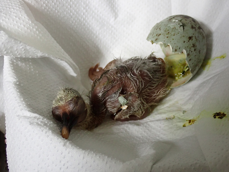 4月9日から嘴打ち(はしうち)など事前の兆候が見られ、経過を注視していたところ、4月11日9時25分、職員がひなの姿を確認しました。このあと、ひなのようすを確認してから親元の巣に戻す予定です。