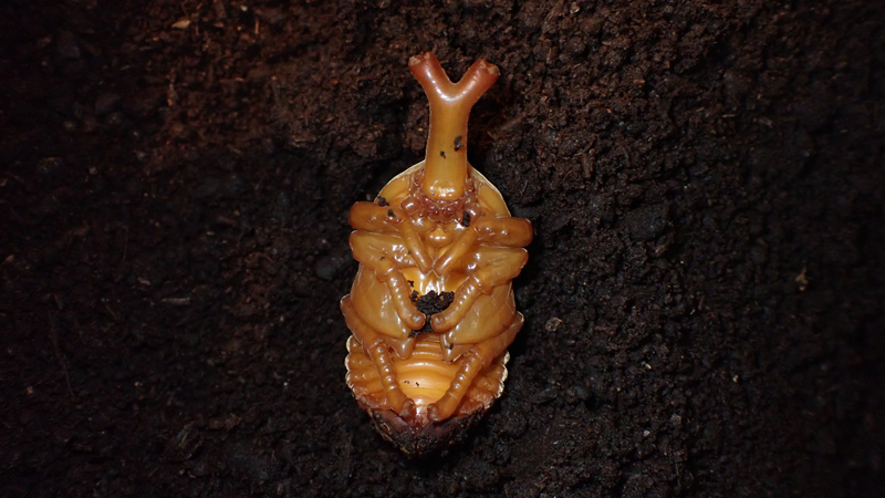 野外でカブトムシを見られる夏は、カブトムシの繁殖の時期でもあります。交尾したメスの成虫が落ち葉の積もった土に潜り、卵を産みます。卵は15日ほどで孵化し、幼虫が生まれます。幼虫は腐葉土を食べながら成長し、2回脱皮をして、秋には大きな3齢幼虫(終齢幼虫)となります。十分に大きくなった幼虫は、そのまま土のなかで冬眠します。発育を再開するのは、春になり暖かくなってからです。5月下旬ごろになると幼虫は、土のなかでさなぎへと姿を変えはじめます。そして、成長の早い個体は6月には成虫となり、地上に姿をあらわします。