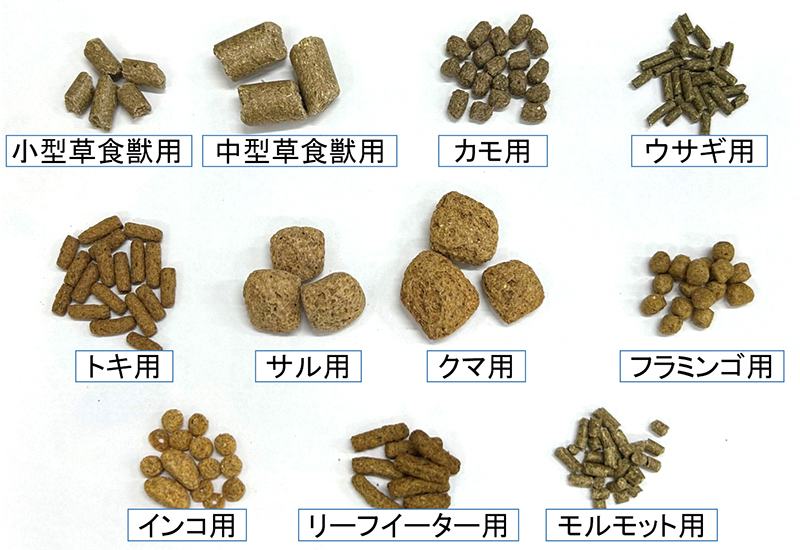 動物用のペレットはさまざまな種類があり、多摩動物公園でおもに利用しているものだけでも10種類以上あります。与える動物の種類や食性ごとに材料を変えており、それぞれに必要な栄養素が含まれ、大きさや形状も動物の種類ごとに食べやすいように合わせて作られています。
