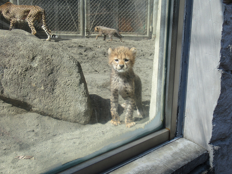 10月には、3頭の子どものうち、メス1頭が九州自然動物公園へ移動しました。移動前の準備として、母親と兄弟から分離する必要がありました。親子ですごした部屋から少し離れた部屋へ、ふだんは使わないチーター用の通路を歩いて移動してもらうため、時間がかかるかと思いましたが、こちらの心配をよそにずんずん進み、スムーズに分離が完了しました。