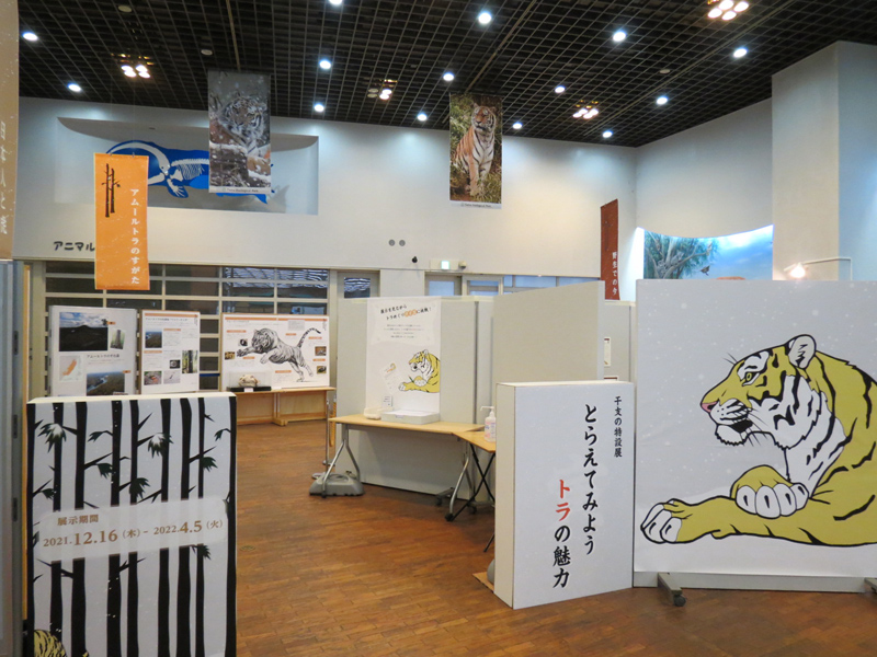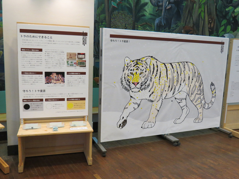 この企画展では、日本人とトラの関係、多摩動物公園で飼育しているアムールトラの生態、そしてトラの野生での状況について、3つのエリアに分けて解説しています。
