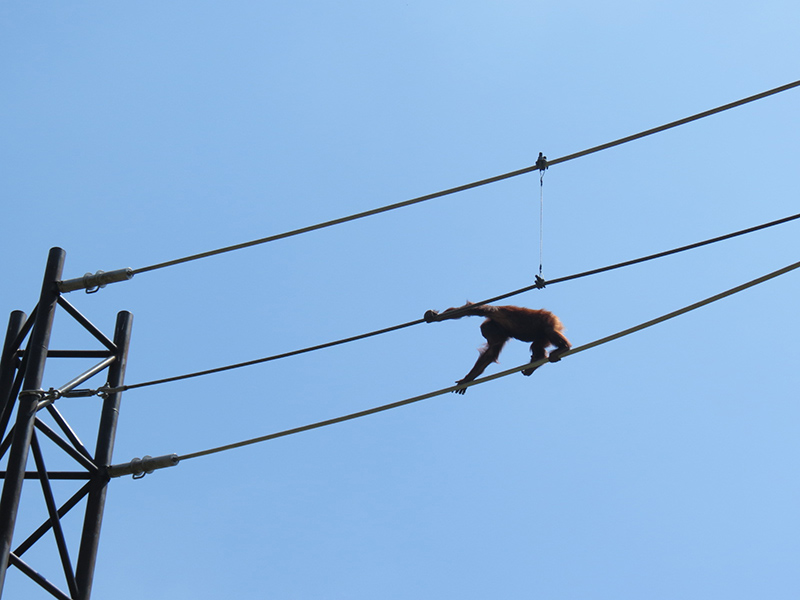 多摩動物公園の「スカイウォーク」は、地上約15メートルに渡したロープをボルネオオランウータンが渡る「空中散歩」です。