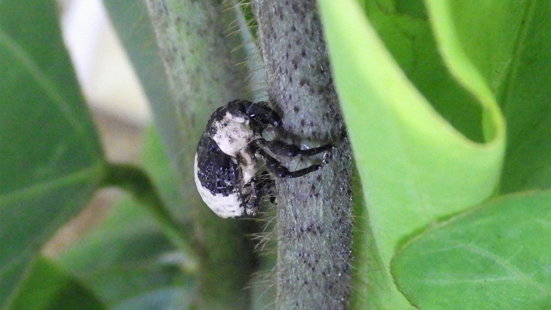 オジロアシナガゾウムシは、クズの葉やツルにしがみついていることが多く、捕まえようとすると体を丸めてポロン!と落ちてしまいます。体を丸めて死んだふりをする姿は、パンダが寝ている姿に見えなくもありません。