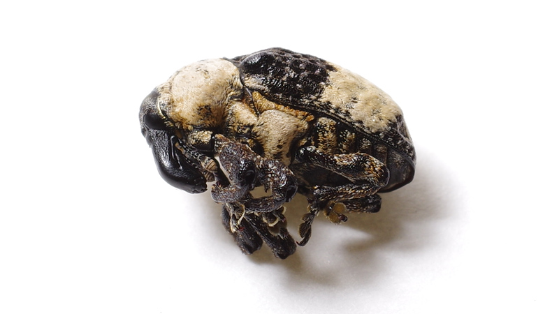 オジロアシナガゾウムシはというと、地は黒色で、鱗毛が生えている部分が白く見えます。写真を拡大してみると、白い部分だけフサフサしています。この鱗毛が濡れると、全体的に黒っぽく見え、パンダらしさがなくなってしまいます。