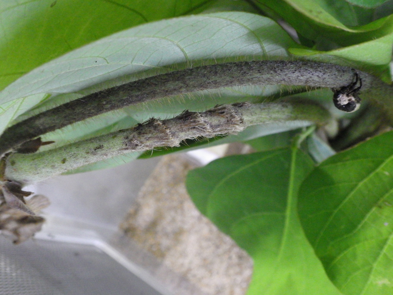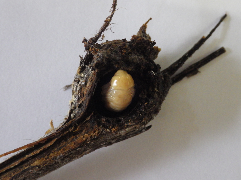 この虫の赤ちゃんはパンダとは似ても似つかず、イモムシ状の幼虫です。親はクズのツルにらせん状に産卵し、幼虫は茎に虫こぶを形成して成長します。