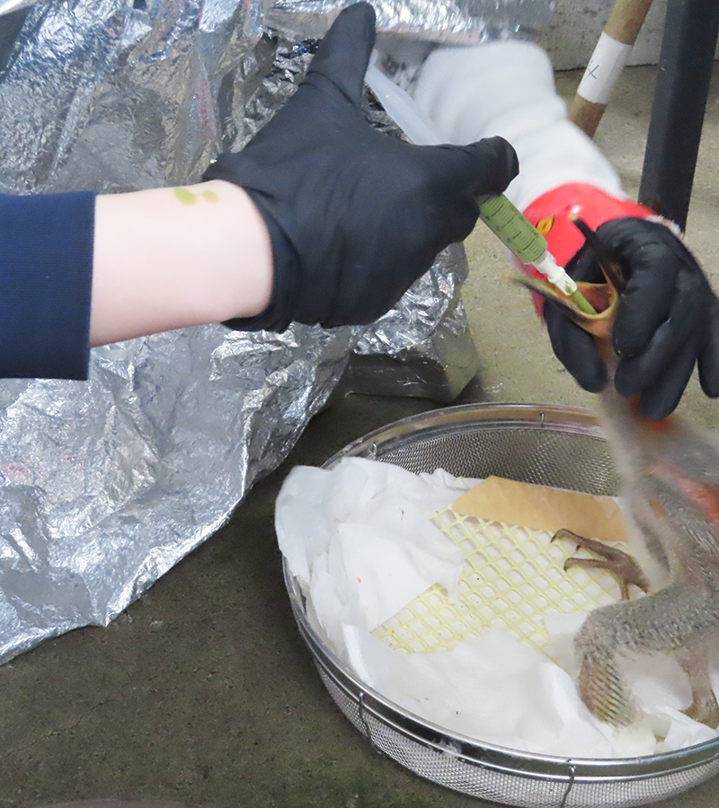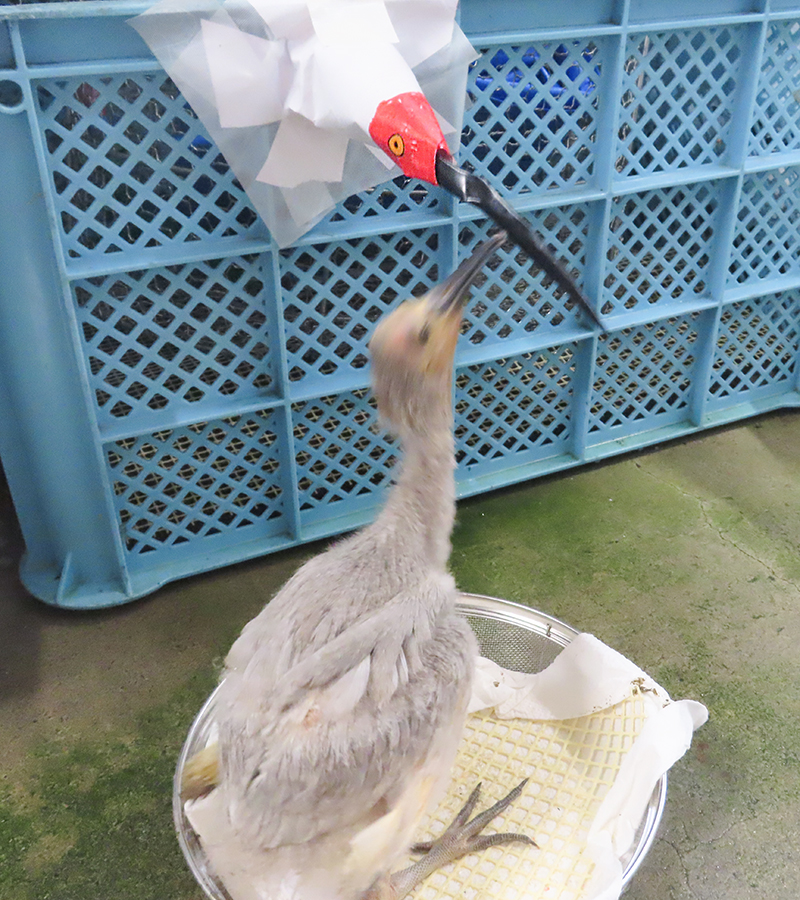 そこで、今回の人工育雛では刷り込み予防の対策を徹底しておこなうことにしました。まず、人間の姿形に慣れてしまわないようにポンチョ、帽子、マスク、黒い手袋を着用しました。その姿でえさを与えるときにはなるべく声は出さず、手には親の顔を模したカバーを装着しました。また、ひなのすごす場所には鳥の頭の模型や写真、鏡を置き、なかまの姿を覚えられるようにしました。