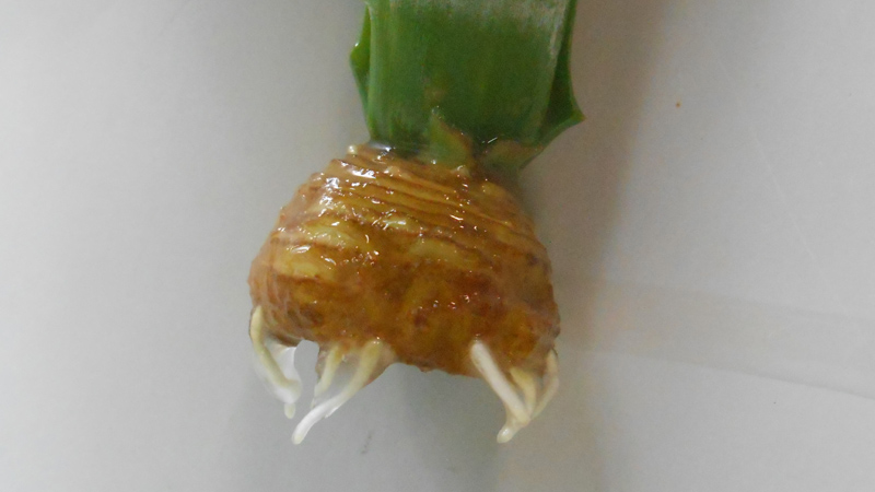 まずは、そのクラウン部の下葉を芯が出るように2~3cm取り除き、水につけました。芯から根のようなものが生えてきた後、鉢に植えて他の植物といっしょに水やりをし、大きく育ったら鉢を大きくする程度で、特に手をかけることもしませんでした。
