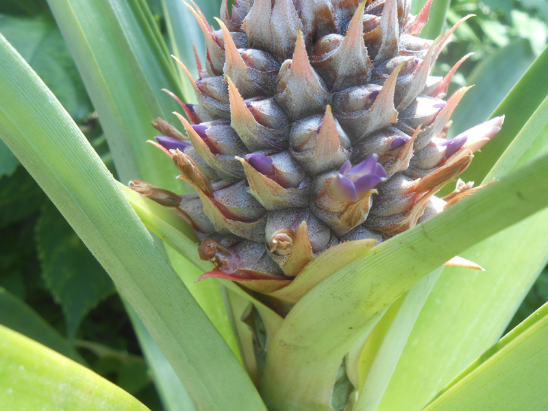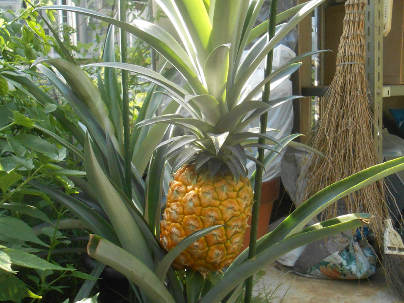 それが、今年の4月に花芽をつけ、紫色の小さな花をたくさん咲かせました。6月には実が大きくなり始め、おなじみのパイナップルの姿になってきました。その後、9月半ばには黄色に色づき、香りも漂わせ完熟しました。