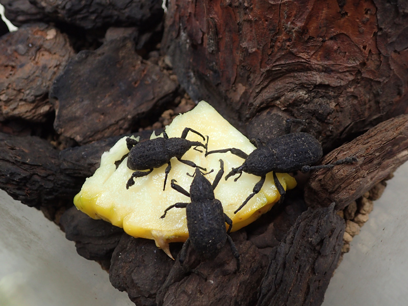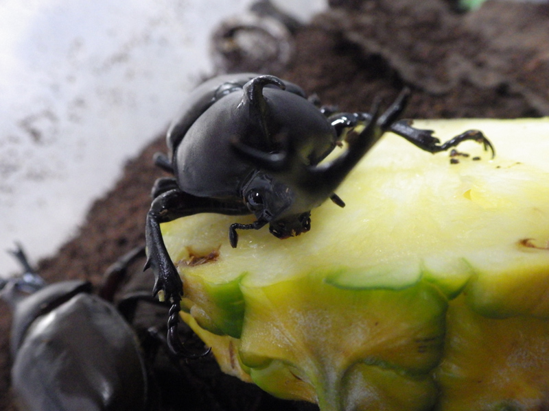 パイナップルを食べるカブトムシとオオゾウムシ