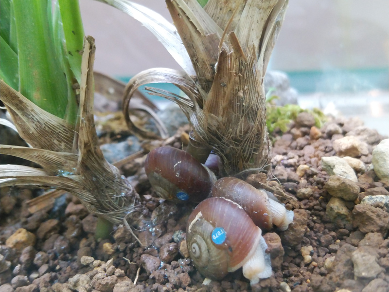 多摩動物公園ではアナカタマイマイの飼育を担当し、2018年には卵の孵化が確認されました(繁殖成功のお知らせはこちら)。その後は遺伝的多様性を考慮した繁殖計画に沿って飼育を続けるとともに、展示の準備も進めていました。