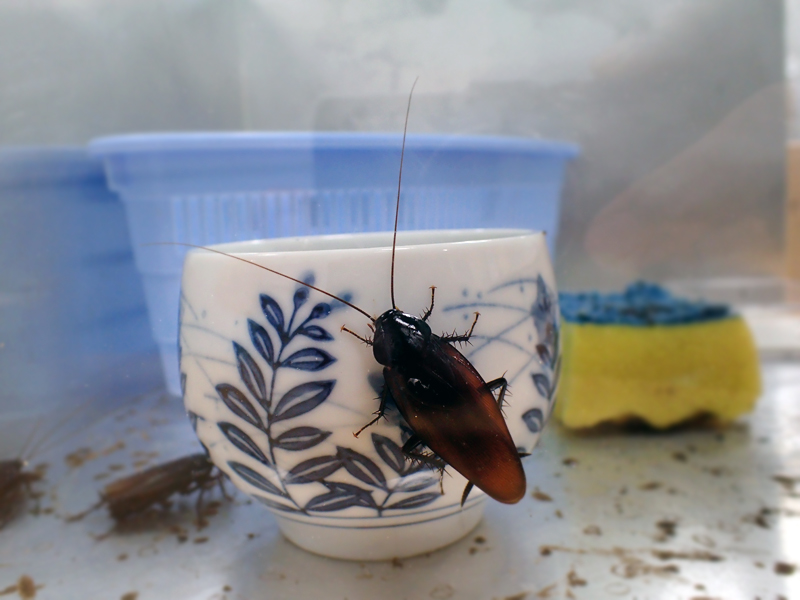 クロゴキブリの展示ケース。ケース上部に塗ってある白いものが炭酸カルシウム