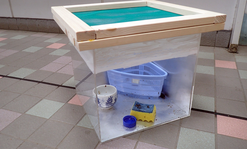 ゴキブリとはち合わせるシチュエーションを再現するため、展示ケースはキッチンのシンクやゴミ捨て場などをイメージして製作しました。下の写真のように、ケースの上部には炭酸カルシウムの粉末が塗ってあります。ゴキブリは炭酸カルシウムが塗ってあると滑ってしまうので、登って出てくることはありません。アクリル越しであれば飛びかかってくる心配もありませんので、まじまじと観察していただけるのではないでしょうか。