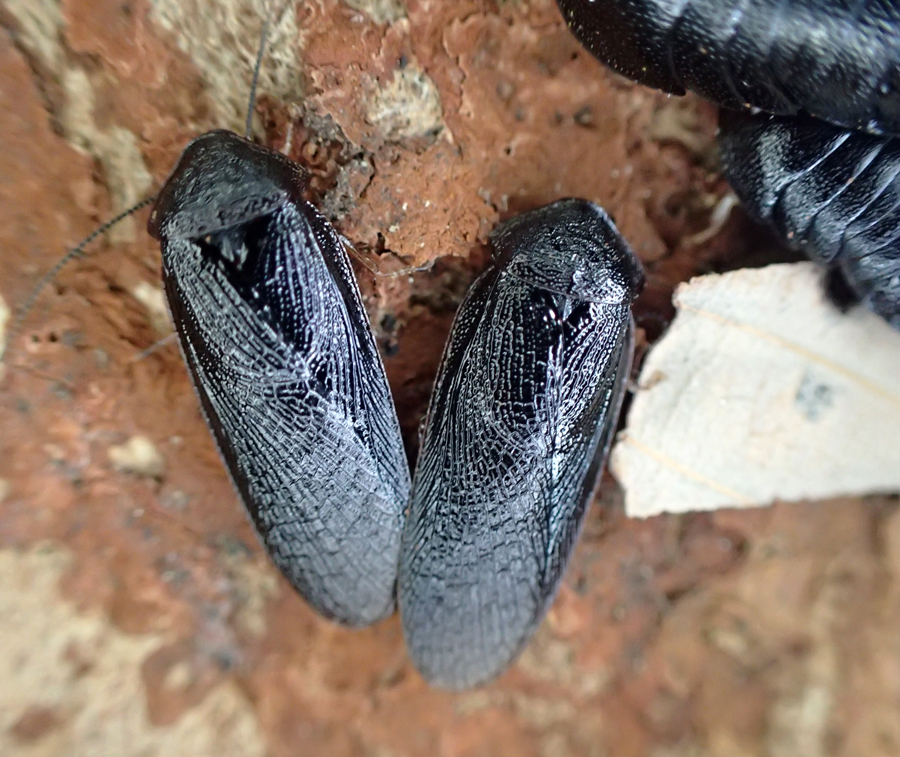 | 写真4:脱皮殻。よく見ると背に切れ込みが見える | 写真5:ヒメマルゴキブリのオス成虫 |