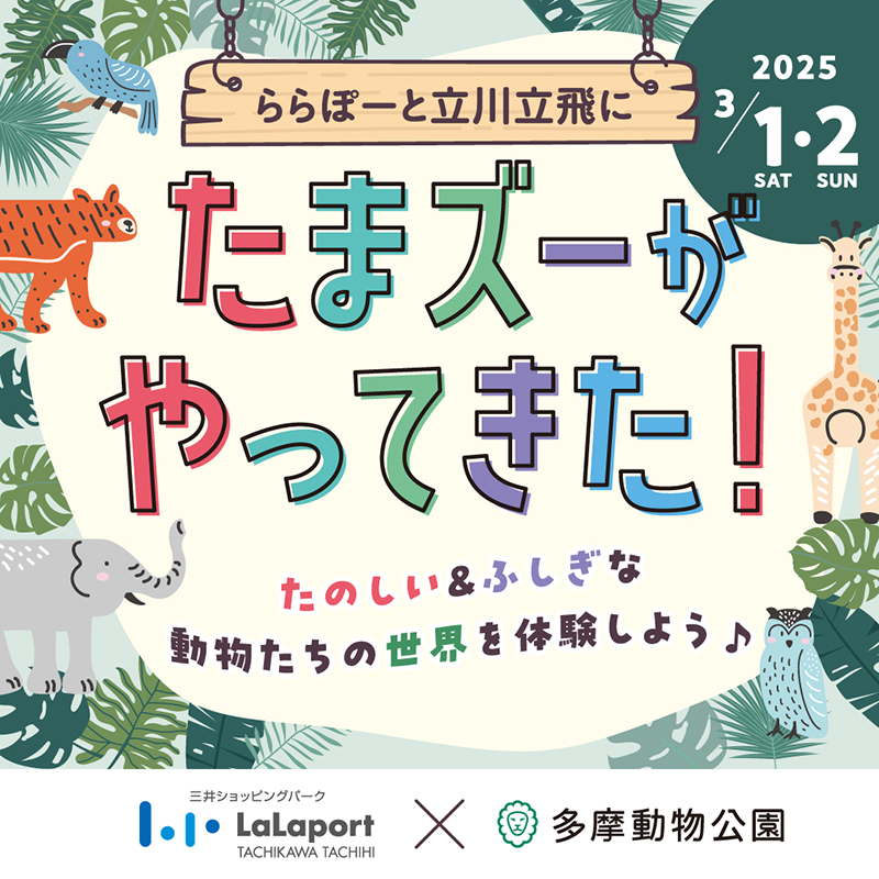 多摩動物公園とららぽーと立川立飛は、親子で楽しく学べる場の創出や、地域全体でのより深い連携を目指して、連携イベントを開催します。ぜひこの機会にららぽーと立川立飛へもお出かけください。