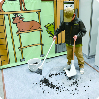 飼育係のユニフォームを着て、ヤギのフンのおそうじ体験をしてみよう!