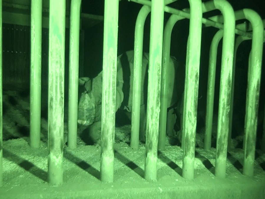 | 夜間放飼初日のナラヤニ | 夜中に採食するビクラム(暗視カメラ映像) |