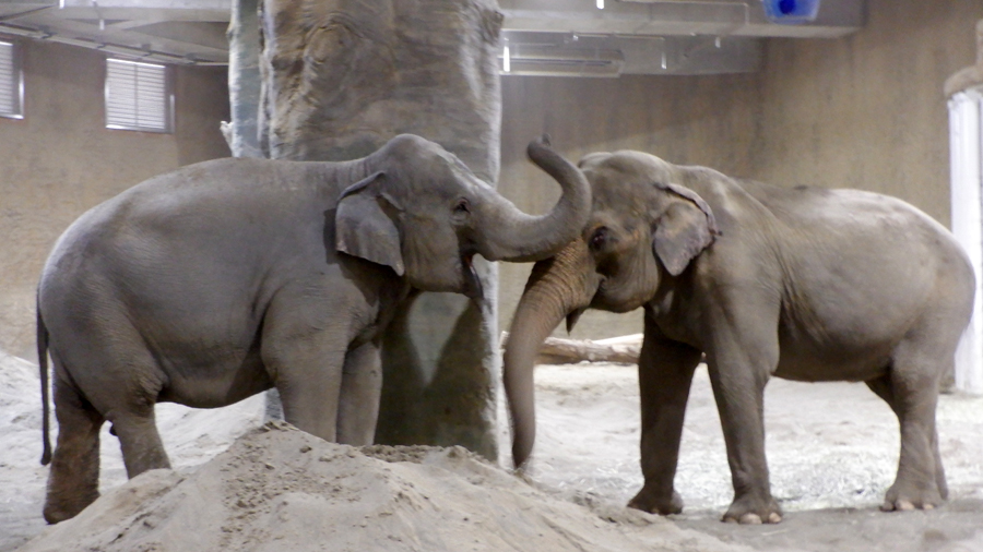 新アジアゾウ舎はオープンに向けて準備中です。室内は完成しましたが、まだ非公開。ここではオスの「アヌーラ」とメスの「アマラ」が生活しています。このたび2頭が1日1時間程度の同居を始めました。