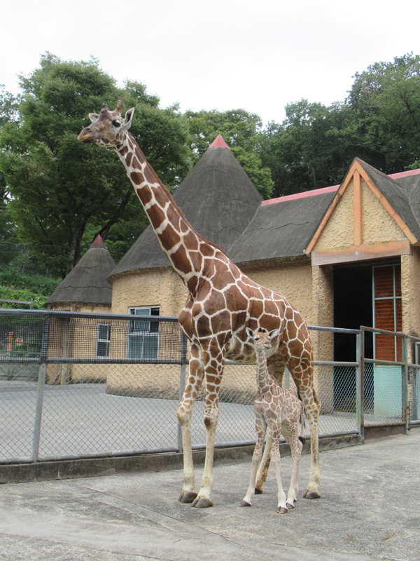 現在、日中は小放飼場に出しています。環境に慣れてきたら親子を群れに戻す予定です。 |  キリン「アミ」親子 |