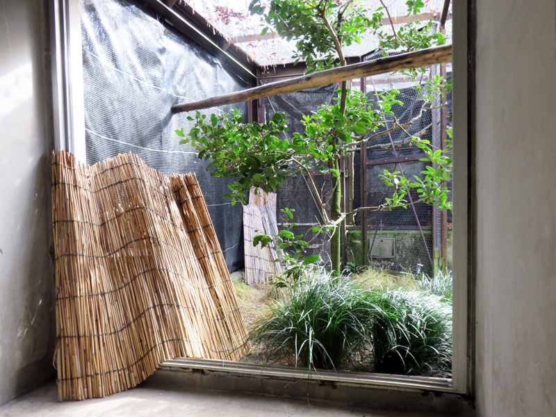 オスはメスが気になるようで、徐々に樹木をつたってメスのいる止まり木まで上がれるようになり、やがて交尾しました。巣箱のある6号室は裏側の作業エリアから見えないように目隠しがしてありますが、わずかな隙間からようすをうかがうと、すぐに気づいて警戒してしまいます。2羽とも野生保護個体だからでしょう、警戒心がとても強いと感じました。