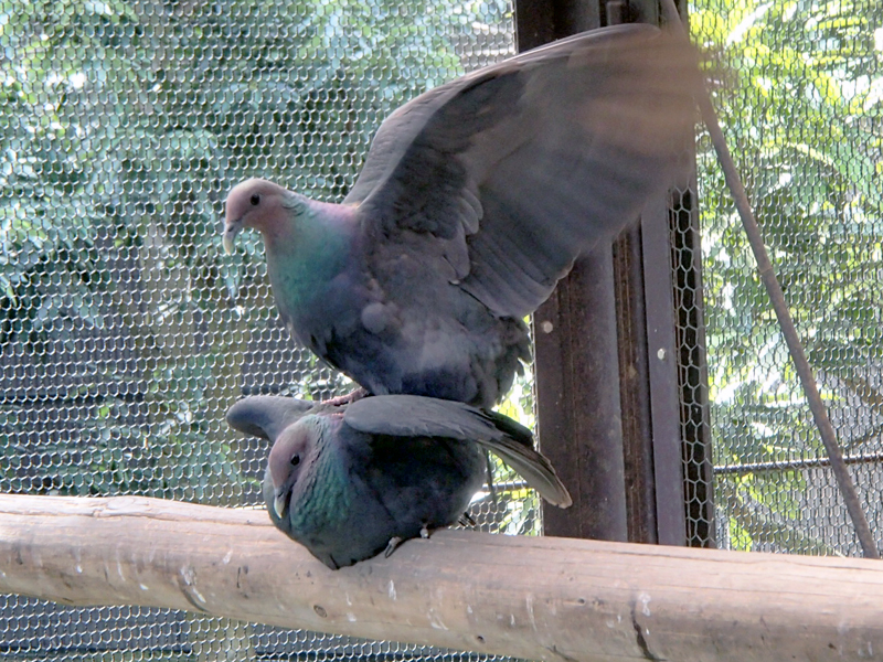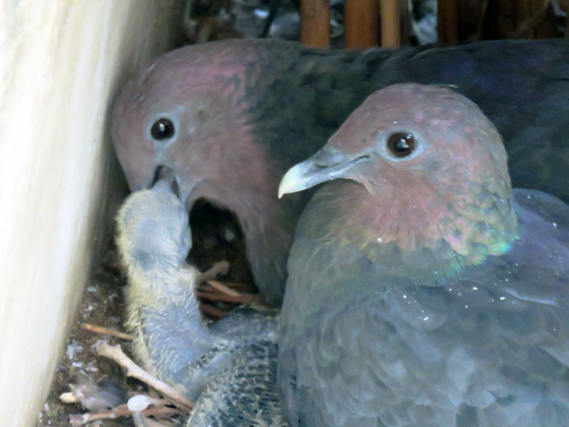 都立動物園(多摩動物公園、上野動物園、井の頭自然文化園)では小笠原固有の絶滅危惧種(亜種)であるアカガシラカラスバトの保護増殖事業に取り組んでいます。多摩動物公園では、昨年(2019年)夏から秋にかけて2ペアから3羽、秋以降には新たに2ペアから8羽、合計4ペアから11羽の自然繁殖に成功し、飼育数は30羽になりました。今回は秋に繁殖した2ペアについてお話しします。