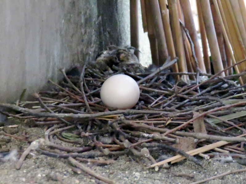 B室では、飼育係が育てたオス1羽をメスの群れの中に入れたところ、人の手を介さず育ち、自ら子育て経験もあるメスとペアになりました。巣箱も置いたのですが、ヨシズで囲った簡易な巣に産卵しました。