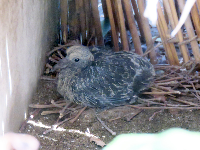最初の2回は台風と雨の影響で巣を放棄してしまい、その後もなかなかうまくいきませんでしたが、今年1月8日に孵化したひなが順調に育ち、5回目の産卵でようやく繁殖に成功しました。巣が地上にあるので外に出やすいことも手伝ってか、ひなも22日齢になるとときどき巣を出歩くようになり、外にいるオスにえさをねだる姿が見られましたが、えさをもらった後はトレイのえさもついばんでから、そそくさと巣に戻って行きました。ひなは2月6日、29日齢で巣立ちました。B室ではその後も2羽の自然繁殖に成功しています。