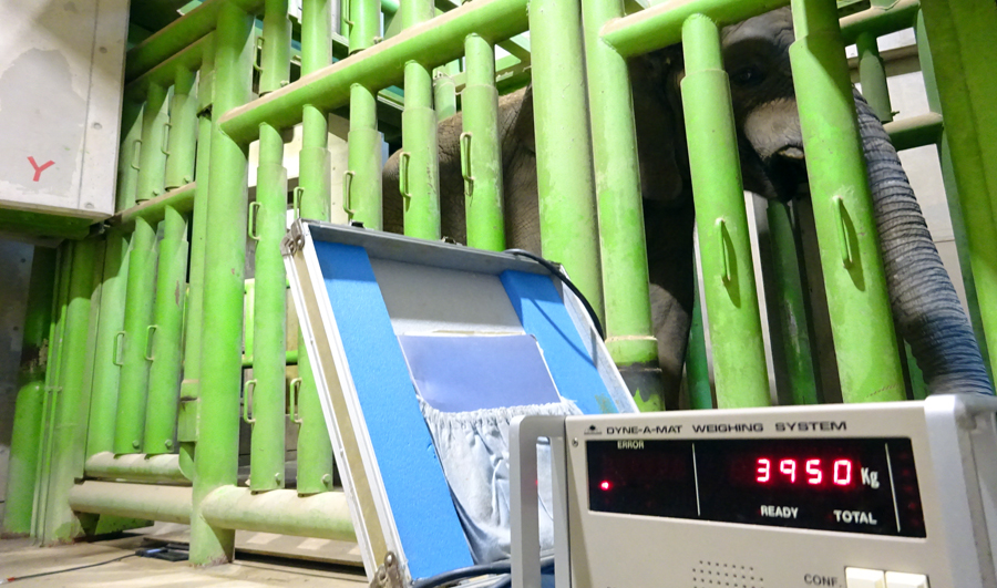 しかし回数を重ねると砥夢の警戒心も薄れ、開始後40分ほどでようやく体重計に乗りました。4回計測した平均値は3,995kgでした。去年の3,550kgと比較すると、405kgの増加です。アフリカゾウはおとなになるまでに1日約1kg増加するといわれているので、砥夢の成長がとても順調ということがよくわかります。