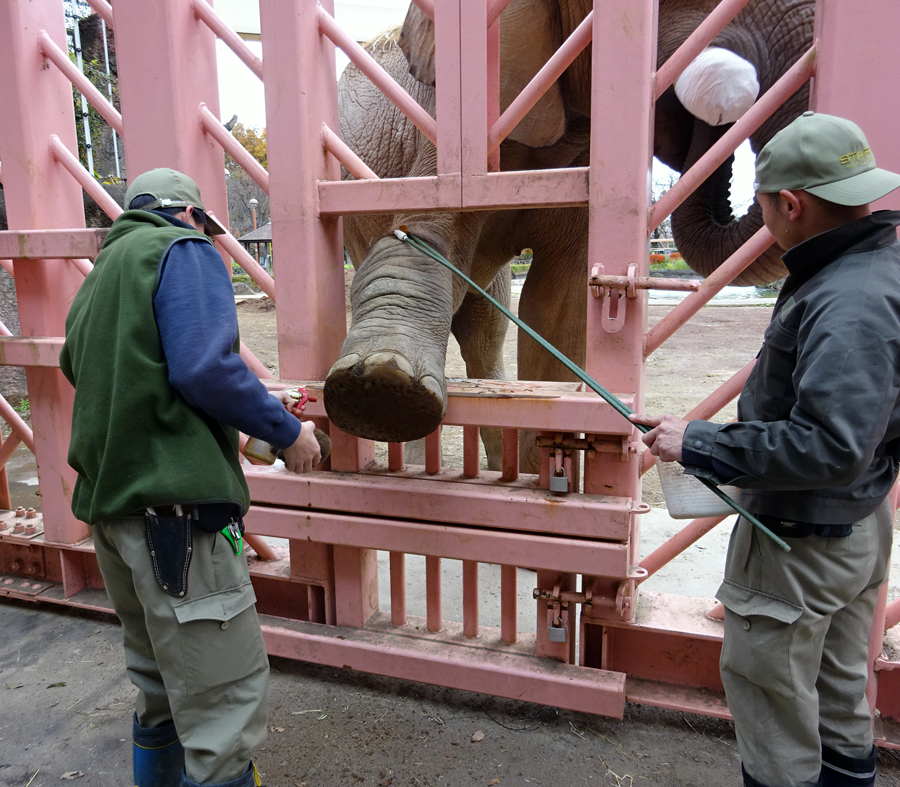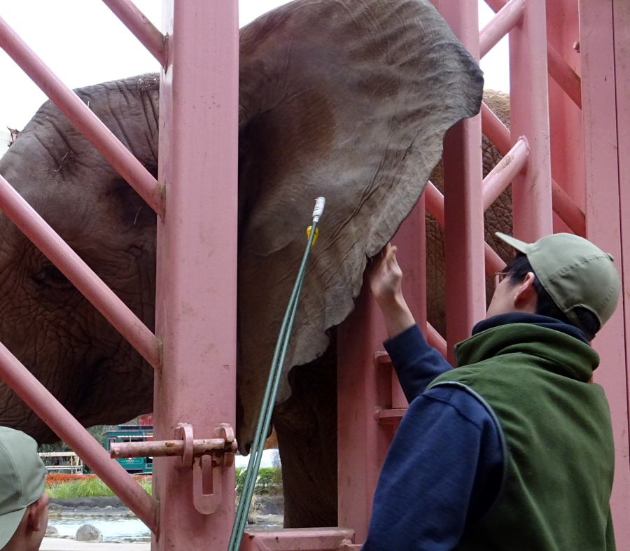 砥夢の牙の治療も毎日このPCウォールを介しておこなっています。しかし、何もせず素直にゾウが足や耳を出してくれるわけではなく、日頃からのトレーニングが必要です。たとえば、足を水で洗った後、たわしでひづめの汚れを取り除くという決まった手順を踏んでいます。耳は手で触り、傷などがないか確認をします。このようなトレーニングを日々おこなうことによって、必要なときにすぐ処置をすることができるのです。
