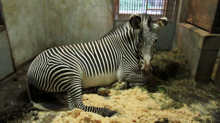 2頭のメスのシマウマと、オスのオリックスは、なかよし広場の上にある旧モウコノウマ舎で公開しています(飼育作業の都合上、14時で公開終了です)。動物が少しでも過ごしやすいよう、夏の夜は風が通るように窓を開け、扇風機を回します。大きな体の草食動物は私たちとは違って、何時間も横になって寝ることはしません。1~2時間ほど座って休息する間にほんの2~3分、目を閉じて眠ります。これを一晩のうちに何度も繰り返します。シマウマもオリックスも警戒心が強いので、日中座る姿を見る機会はほとんどなく、自分の部屋では写真のようにリラックスした姿を見せることがまれにあります。