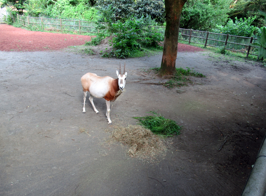 オリックスは日中、小さな放飼場で過ごしていますが、運動不足を解消し、蹄が伸びるのを予防するため、夏の夜は広い場所で過ごせるようにしました。広い放飼場に日中はシマウマ、夜間はオリックスと交替させています。ふだんと違う広い放飼場にいったん出ると、小さな放飼場には戻ってこないのではないかと心配しましたが、翌朝になるとオリックスたちは落ち着いたようすでいつもの放飼場にちゃんと戻ってきました。この夜間放飼はしばらく続ける予定です。