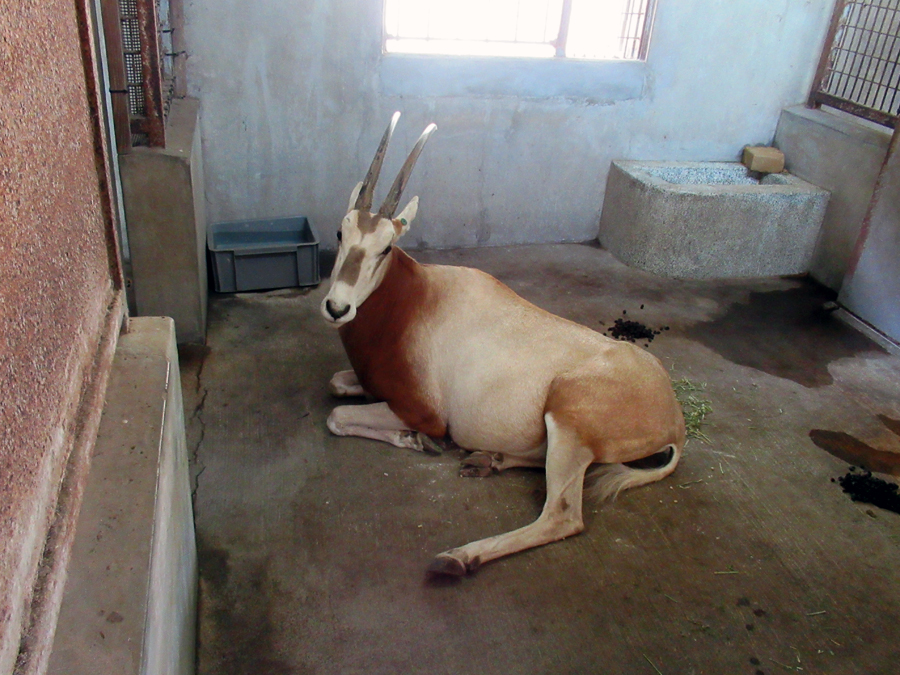 | 室内で座って休むシロオリックス | 広い放飼場で食事中 |