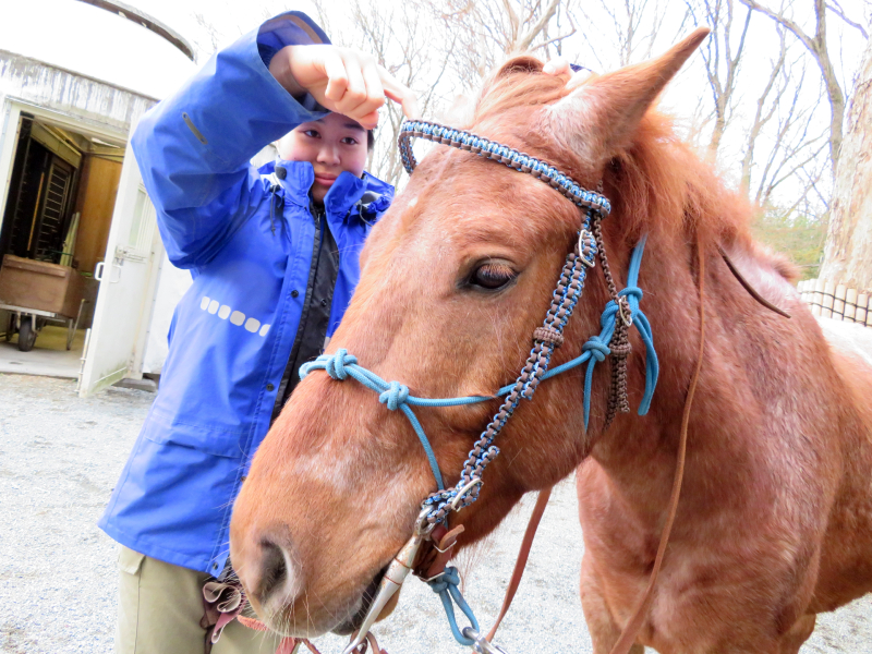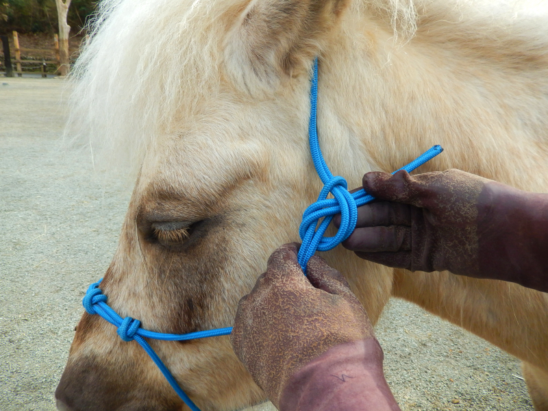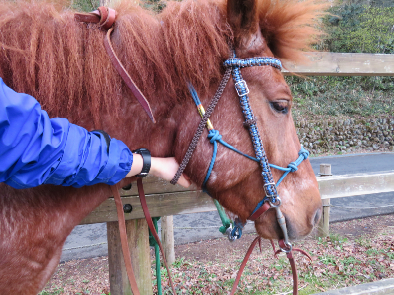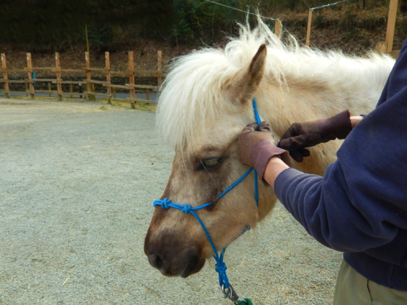 仁太郎。乗馬時に使用する「頭絡」を装着したところ