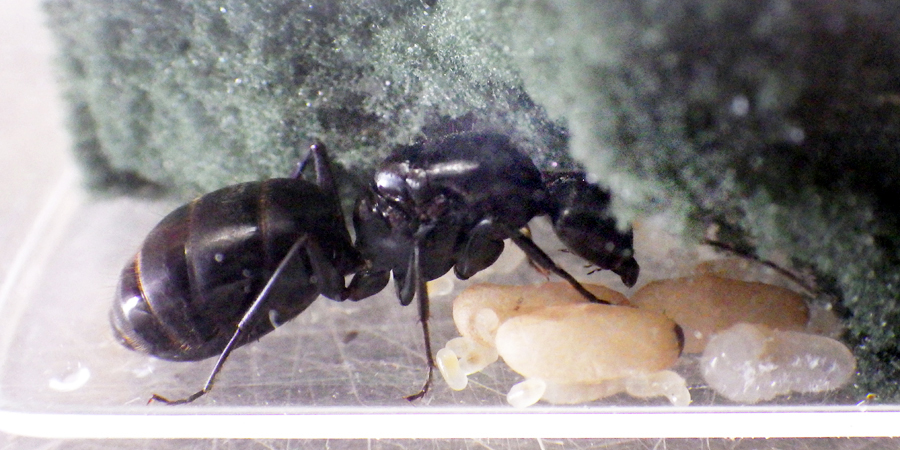 子育て中のクロオオアリの女王。幼虫と蛹の世話をしている